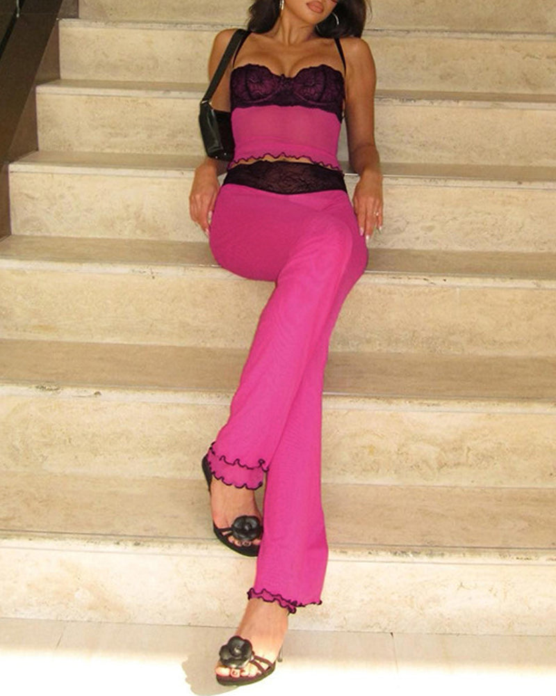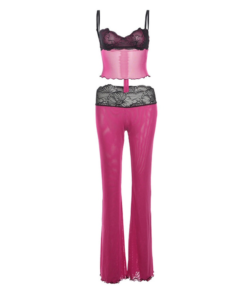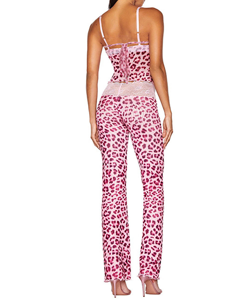 Unleash fierce yet effortless style with this bold two-piece set. The sleeveless tank top mixes leopard print and colorblock panels with delicate lace and sheer mesh inserts, while the matching long pants feature a butt-lifting design for a curvy silhouette. Versatile enough for lounging at home or stepping out in confidence, this set blends edge, comfort, and head-turning allure.