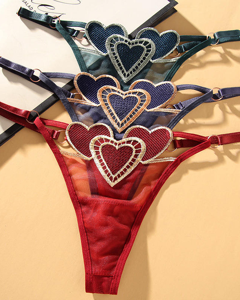 Add a touch of romantic charm to your lingerie collection with these delicate thongs. Featuring sweet heart-shaped embroidery on sheer mesh fabric, they offer a flirty yet sophisticated look. Designed for seamless comfort and all-day wear, these thongs blend whimsical detail with sensual transparency.