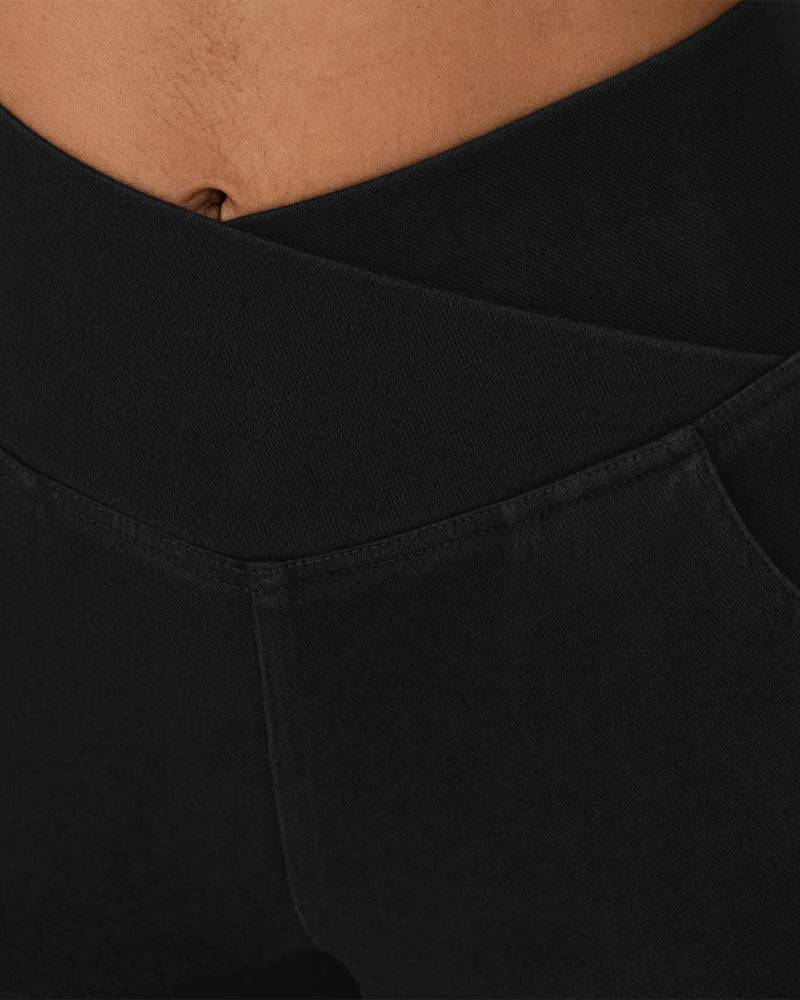 Featuring a flattering high-waisted design, soft stretch denim, and statement cross pockets, these washed flare jeans offer a stylish twist on a classic silhouette—perfect for everyday casual wear.