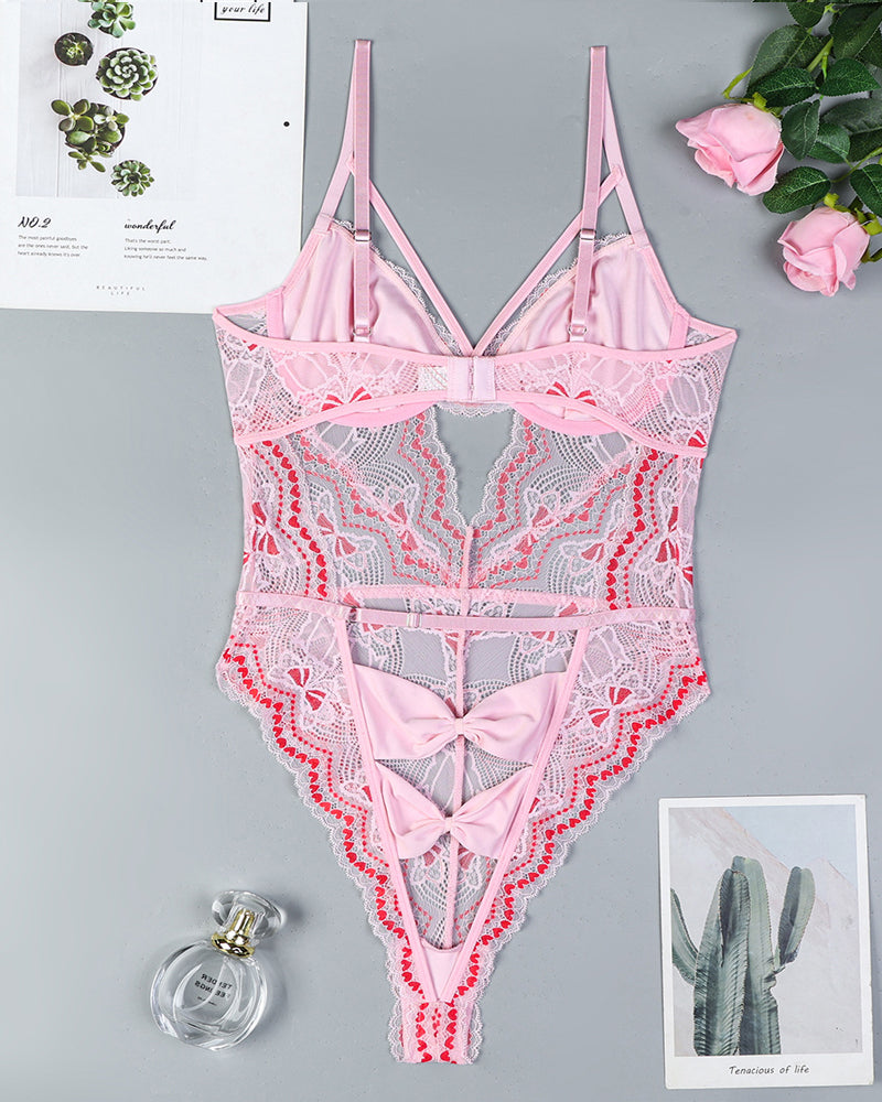 Embrace playful elegance in this contrast lace bodysuit, featuring a charming hip bow and alluring hollow-out detailing. The bold color-blocking and delicate lace create a striking visual appeal, while the form-fitting design enhances your curves with a comfortable, seamless fit. Perfect for adding a touch of seductive charm to any occasion.