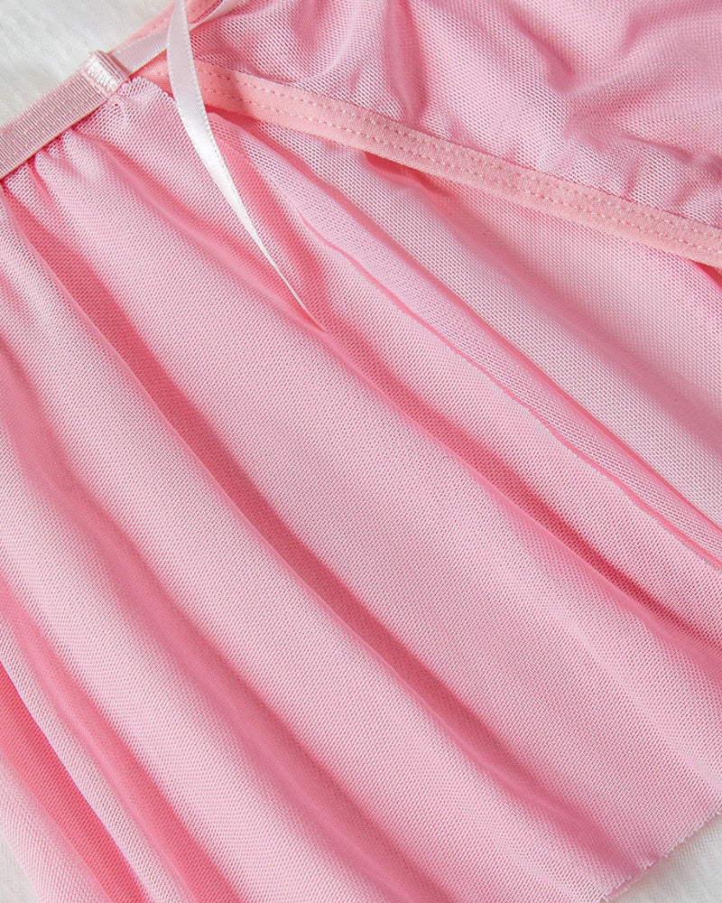 This plus-size friendly ensemble features strategic floral lace cut-outs at the chest, framed by whisper-soft sheer mesh fabric that teases while covering.