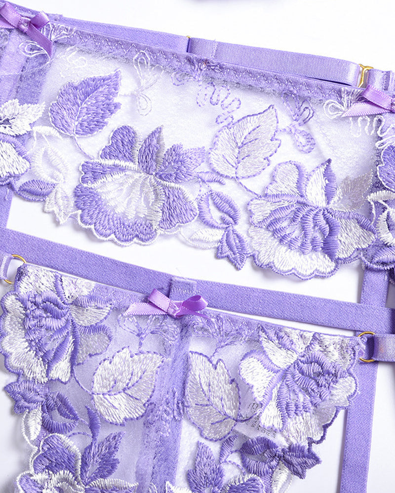 Unveil ethereal romance in this exquisite purple lingerie set. Delicate floral embroidery adorns sheer lace and mesh fabric, enhanced by strategic hollow-out details for a tantalizing play of skin and texture. Designed with matching garter straps, this ensemble offers head-to-toe allure—perfect for bridal boudoir, intimate evenings, or artistic photography.