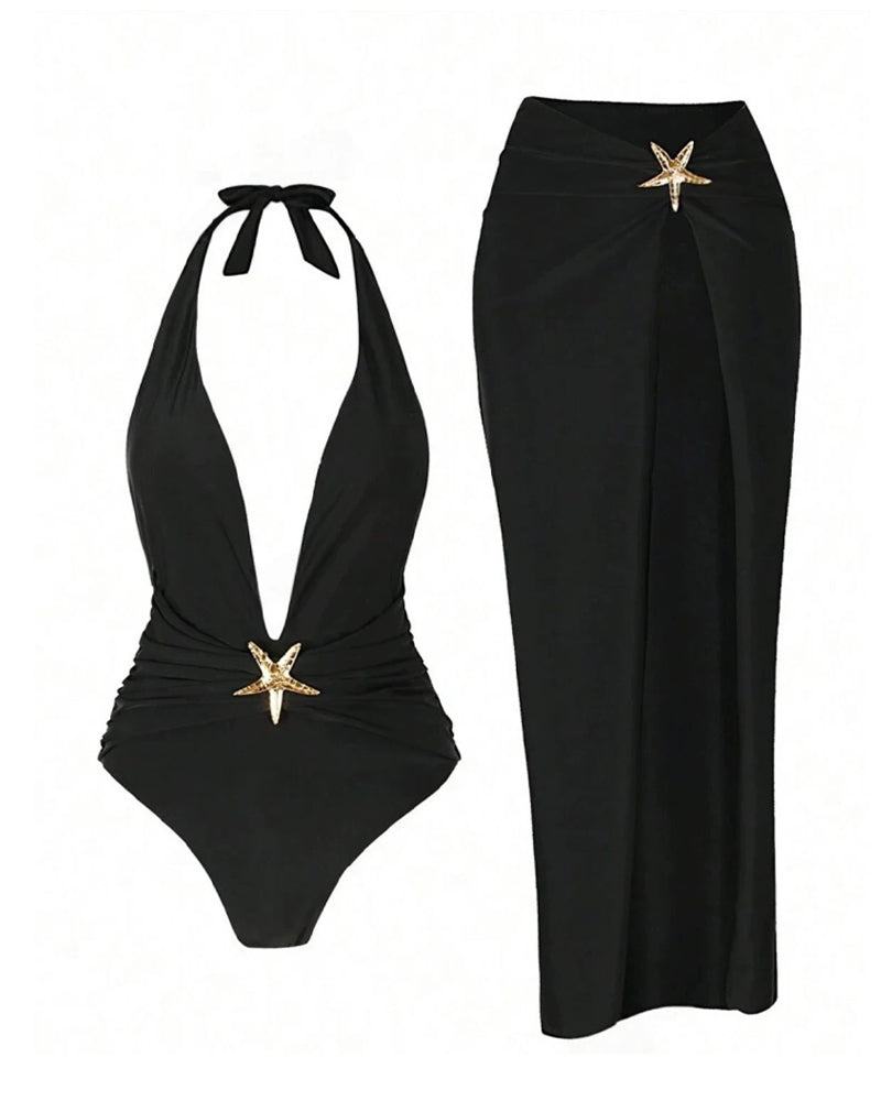 Command the shore with sleek sophistication in this two-piece swim set. Featuring a deep V halter-neck swim top and a matching high-slit skirt, this ensemble blends daring allure with versatile coverage—perfect for transitioning from swim to stylish resort wear.