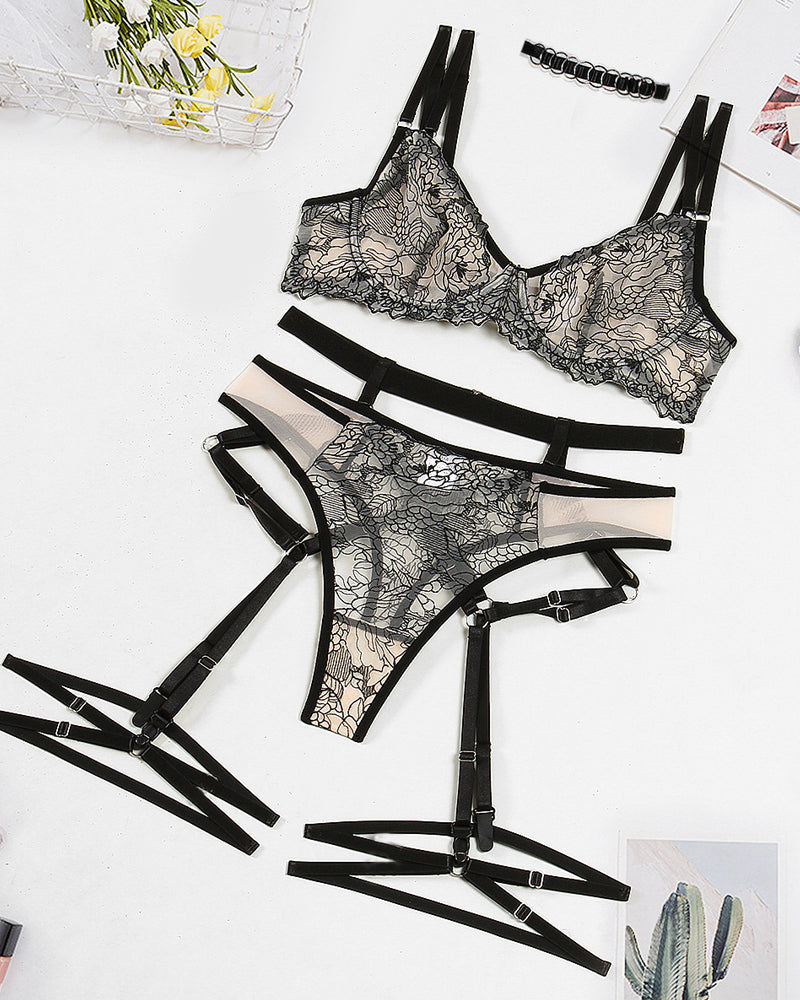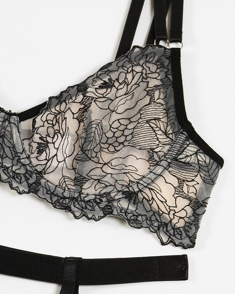 Bloom into elegance with this exquisitely crafted lingerie set, featuring delicate floral embroidery artfully spliced with soft sheer mesh. The intricate embroidery and transparent panels create a captivating play of texture, while the seamless construction ensures a smooth, flattering fit. Perfect for intimate moments or romantic evenings, this set blends artistry with allure.