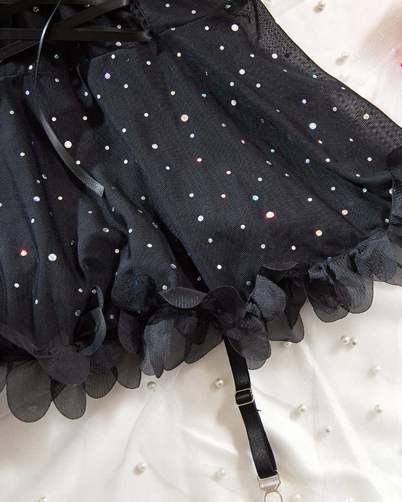 Indulge in Parisian elegance with this exquisite lingerie set. Delicate French lace and sheer mesh are artfully adorned with shimmering sequins, creating a captivating play of light and texture. Designed to flatter your figure with its refined craftsmanship, this set brings timeless sophistication to your most intimate moments.