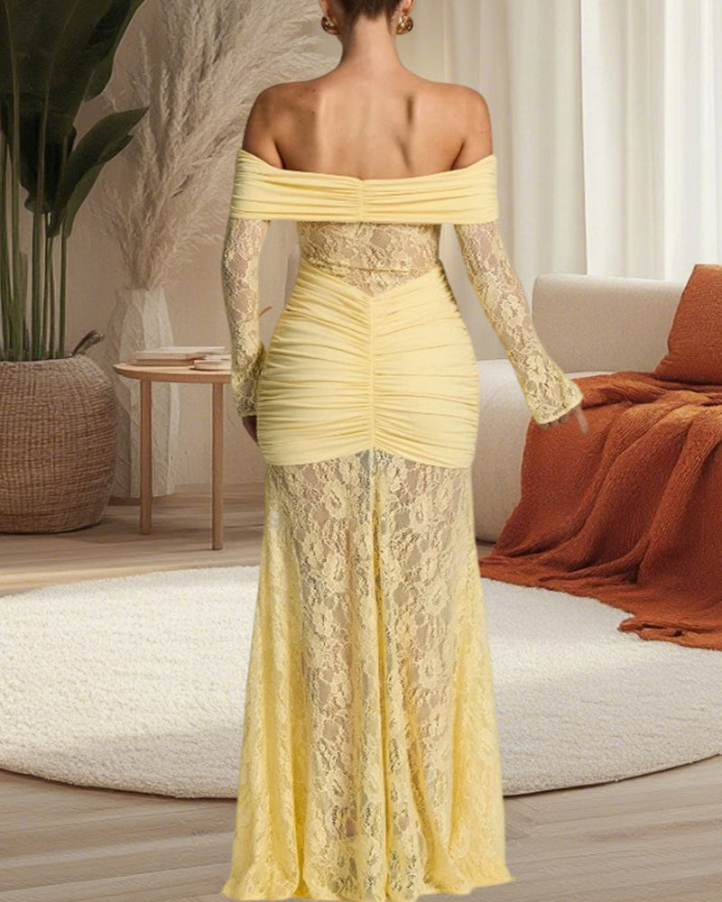 Make a dramatic entrance in this breathtaking maxi dress. The off-shoulder neckline and fitted long sleeves are adorned with delicate lace, while the flared fishtail hem adds a touch of red-carpet glamour. Designed to hug your curves from chest to knee, this dress exudes timeless elegance for unforgettable evenings.