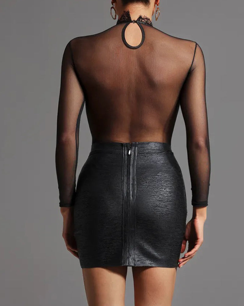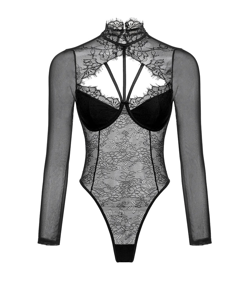 Embrace alluring elegance in this long-sleeved bodysuit. Delicate lace and sheer mesh create a tantalizing see-through effect, while the sleek silhouette hugs your curves. Perfect for layering or standing alone, this piece balances coverage and seduction for unforgettable moments.