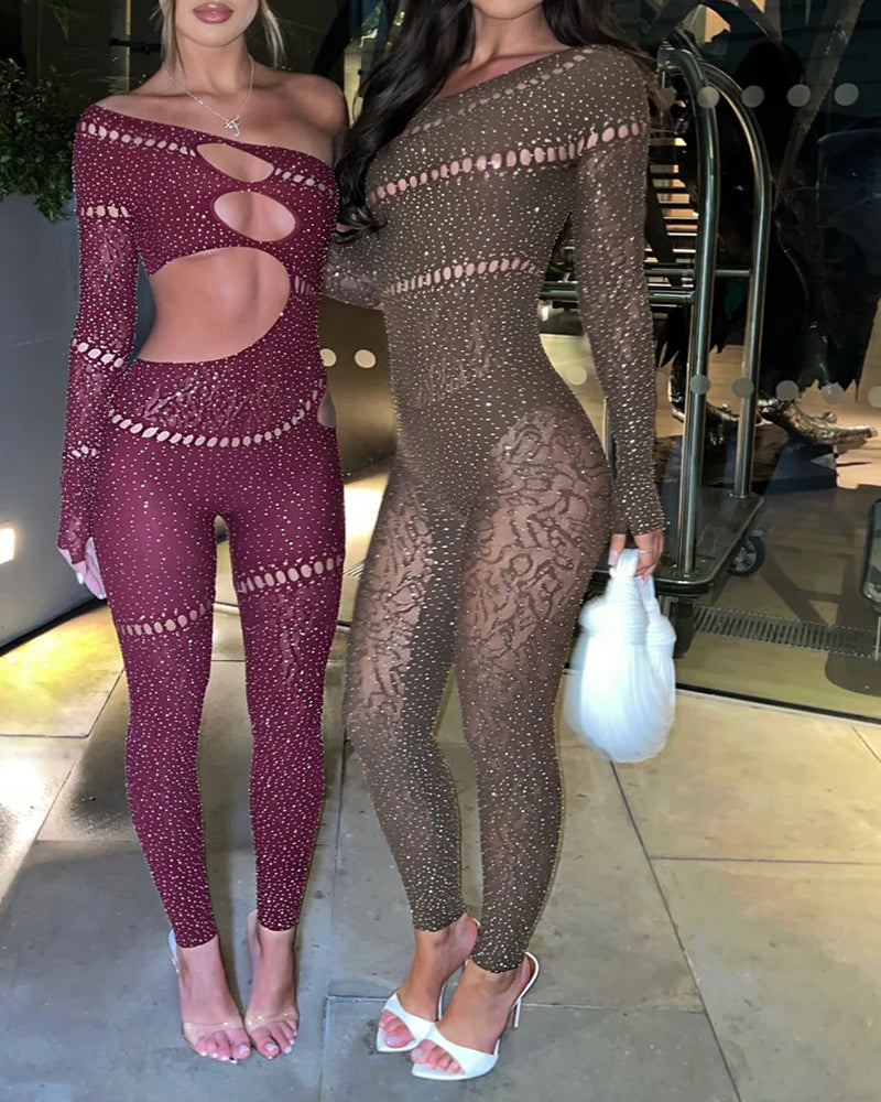 Sparkle from head to toe in this dazzling long-sleeved jumpsuit. Adorned with shimmering rhinestones and crafted from flexible stretch fabric, it offers a body-hugging fit with maximum glamour. Perfect for parties, performances, or special evenings out, this jumpsuit blends show-stopping shine with effortless elegance.