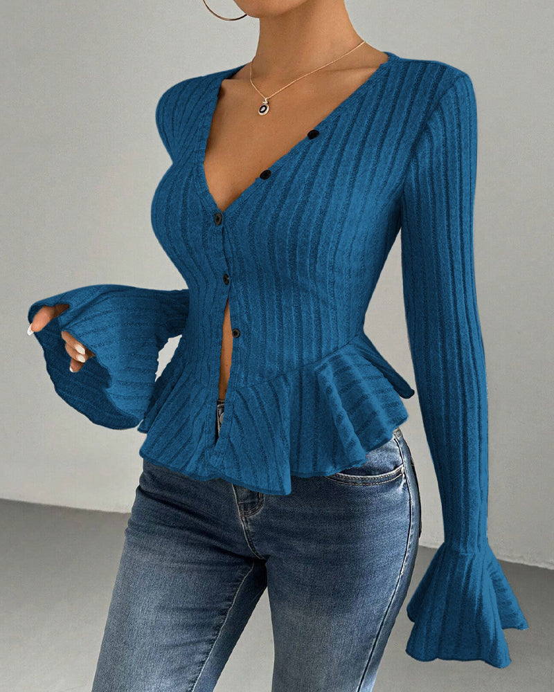 Elevate your everyday style with this graceful knit top. The V-neckline flows into delicate ruffled accents, while a slim-fit bodice and flared long sleeves create a flattering, romantic silhouette. Made from soft, stretchy knit fabric, it offers all-day comfort and effortless versatility—perfect for pairing with jeans, skirts, or tailored pants.