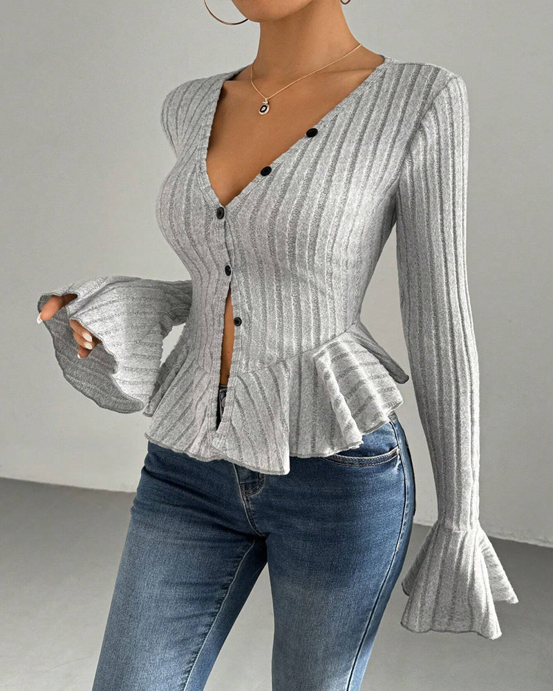 Feminine Detail: V-neck with ruffled trim and flared long sleeves