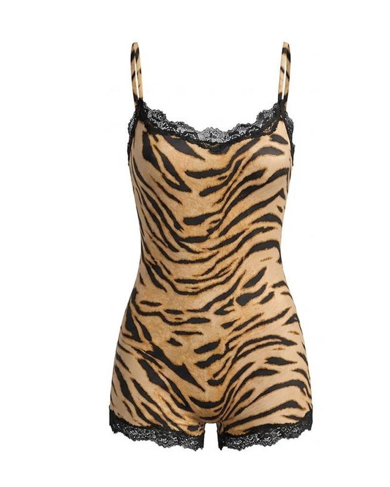 Step into vintage-inspired allure with this sleek sleeveless bodysuit. Featuring a bold abstract tiger print, delicate lace trim, and a seamless stretch fit, this piece effortlessly shapes your silhouette—perfect for layering or wearing solo with confident, minimalist style.