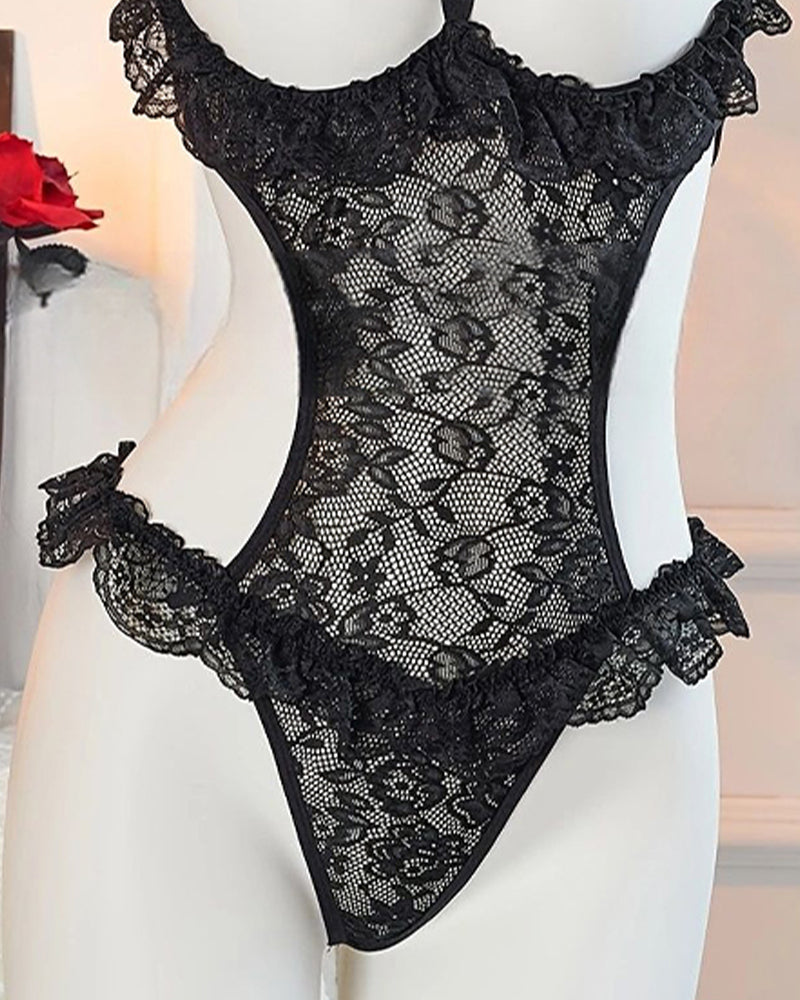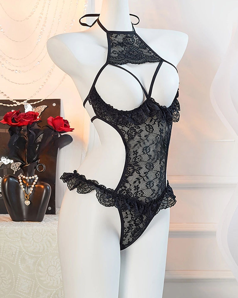 Unveil romantic allure in this striking one-piece. Featuring a delicate floral lace bodice, a revealing bust cutout, and an adjustable halter neck, this bodysuit blends soft femininity with daring transparency—perfect for intimate moments or confident layering.