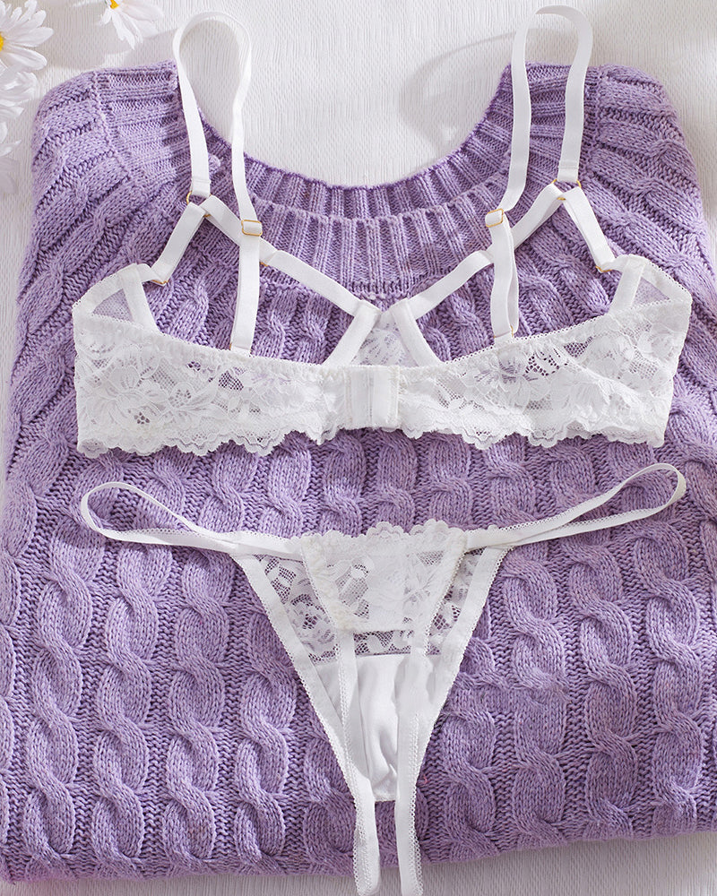 Bloom with delicate allure in this romantic lingerie set. Featuring intricate floral openwork lace and sheer fabric, it offers a tantalizing play of skin and texture. Designed for both comfort and seduction, this set is perfect for intimate moments or adding a touch of everyday elegance.
