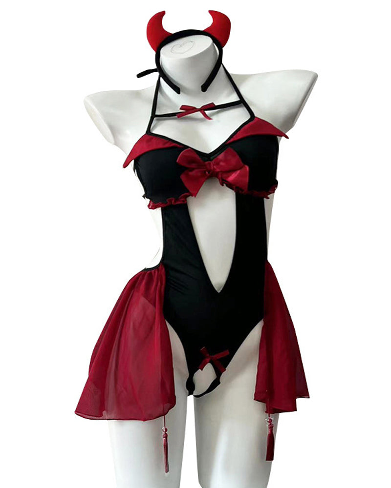 Unleash your playful wicked side in this daring devil-inspired bodysuit. Featuring provocative hollow-out details, fiery accents, and a figure-hugging fit, this lingerie set is designed for immersive role-play and seductive fantasy. Perfect for parties, intimate adventures, or bold self-expression.