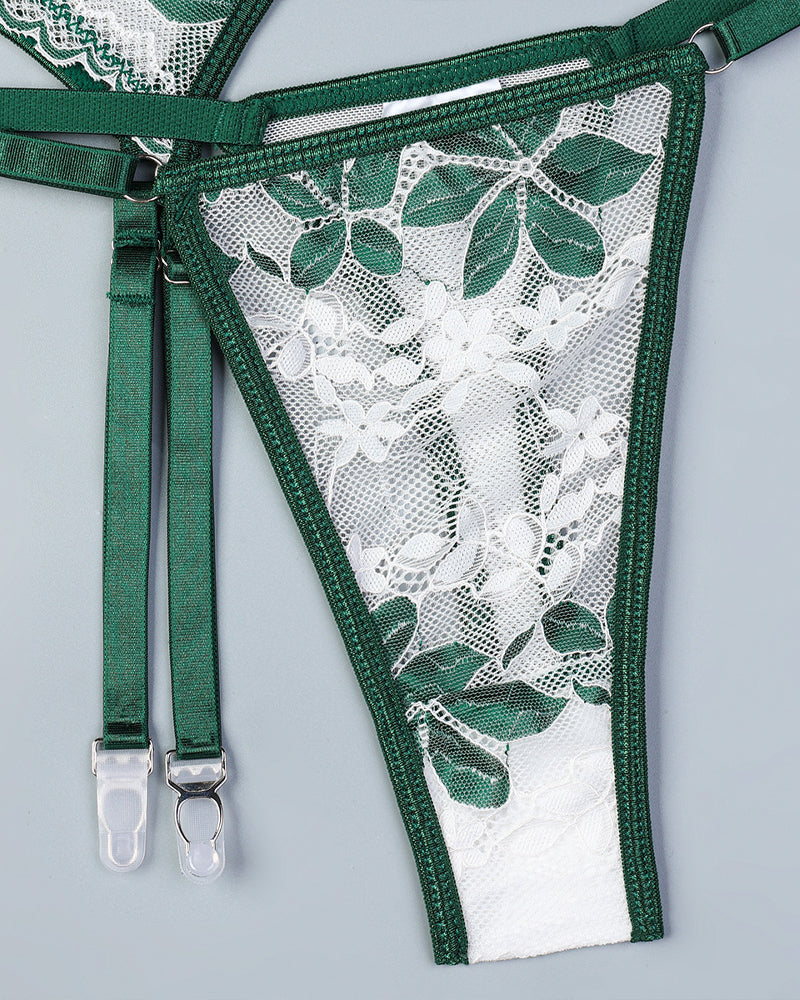 Channel timeless allure with this retro-inspired colorblock lingerie set. Featuring delicate green leaf lace and contrasting color panels, this ensemble blends vintage charm with modern seduction. The included stockings complete the elegant look, perfect for romantic evenings or intimate moments with a touch of classic glamour.