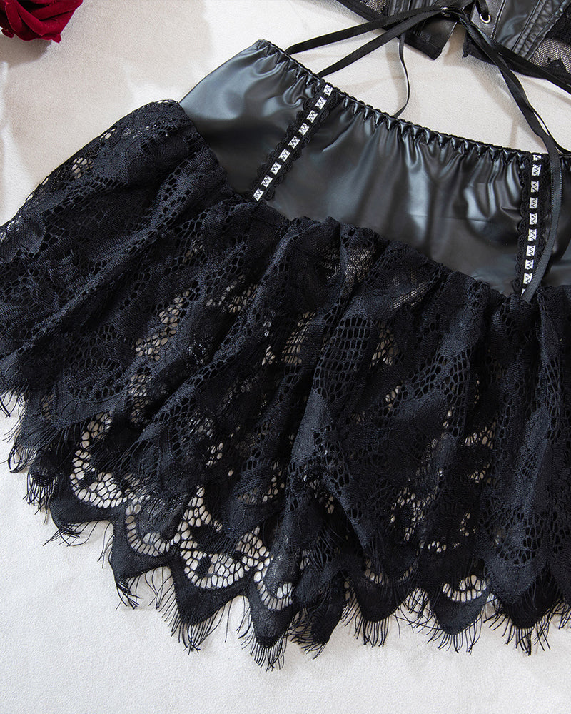 Unleash your inner confidence with this daring lingerie set that masterfully combines the edgy allure of PU leather with the delicate charm of see-through lace. Designed with intricate strappy details and a seductive see-through panel, this ensemble creates a captivating silhouette that's both bold and beautifully feminine. Perfect for making an unforgettable statement.